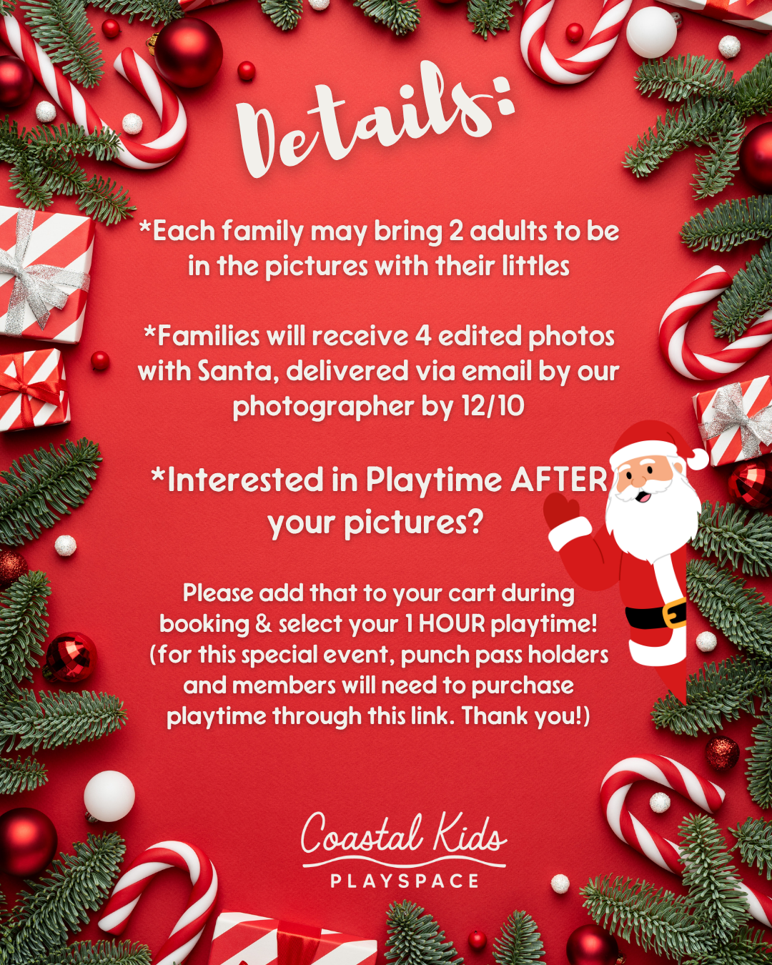 If your little one will want to stay & play after getting photos with Santa, please also reserve a “1 Hour Playtime” session when making your Santa reservation. If playing, please bring grip socks for your little one(s) and regular socks for all adults.