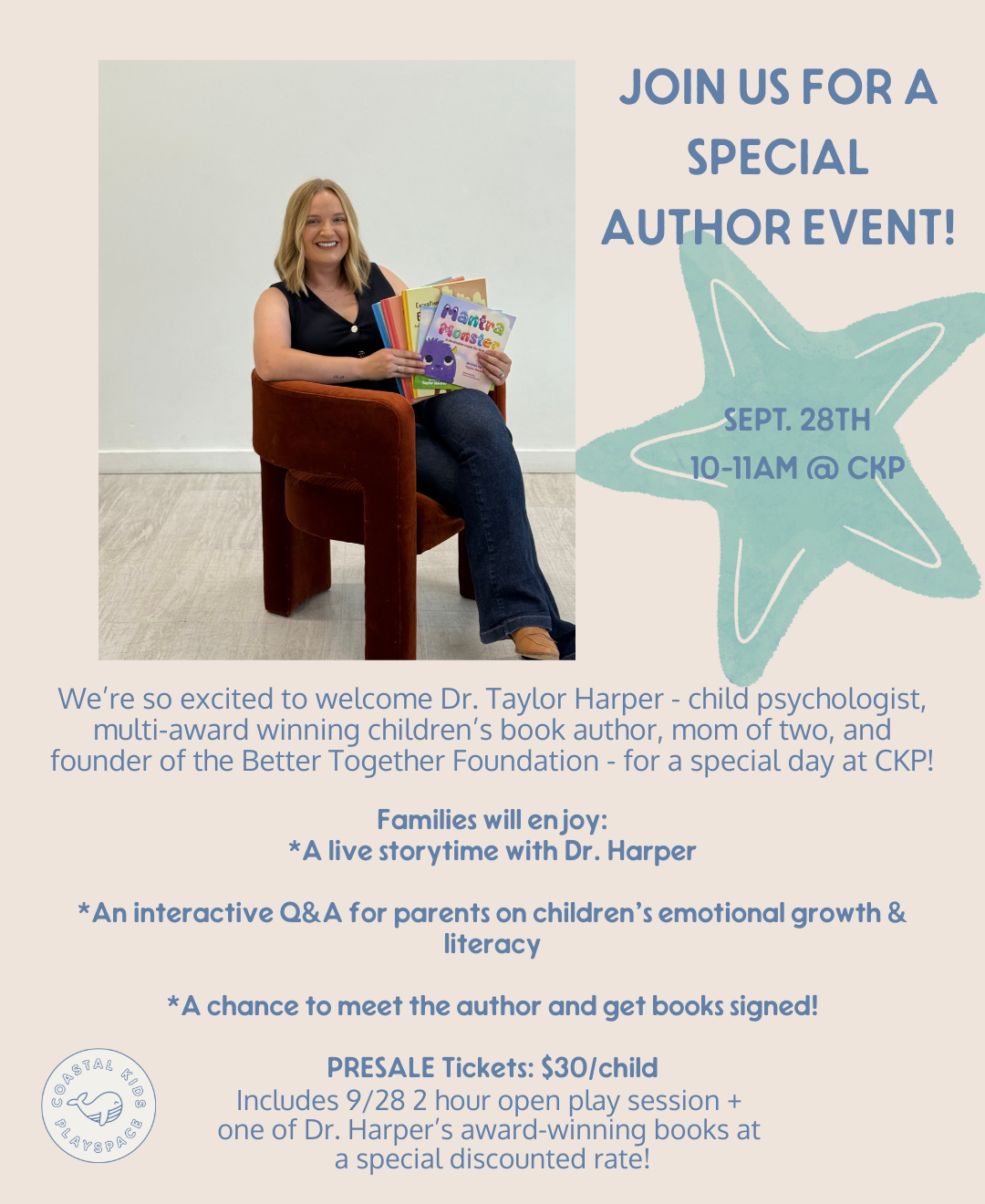 Open play today will feature a VERY special event….a story time at 10:00am with local author, Dr. Taylor!! She will have several of her books for sale & signing after story time concludes.